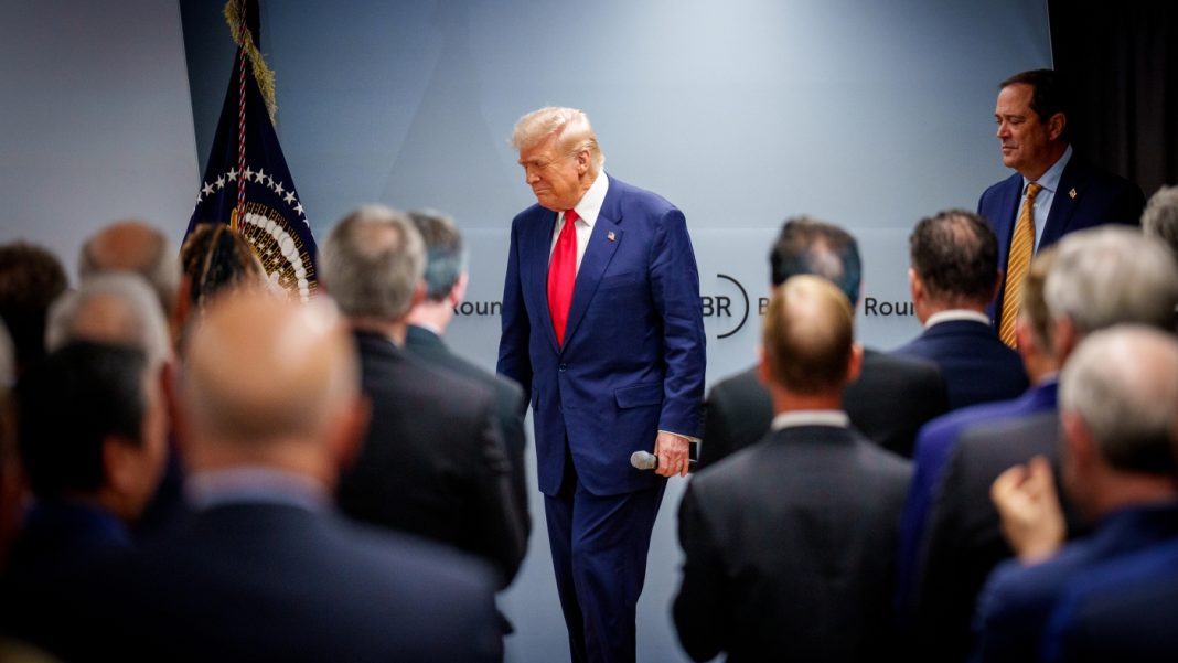 President Trump arrives at the Business Roundtable’s quarterly meeting on March 11, to address a group of CEOs amid an ongoing market selloff sparked by his new tariffs.