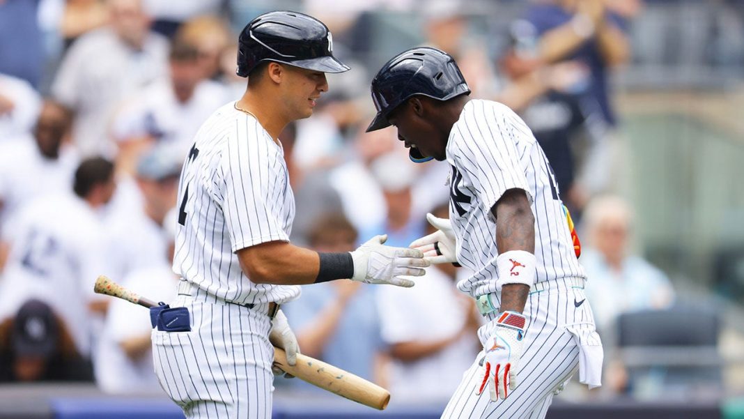Jazz Chisholm Jr. #13 of the New York Yankees celebrates with Anthony Volpe #11 after hitting a third-inning home run against the Milwaukee Brewers at Yankee Stadium on March 29, 2025, in New York City. (Mike Stobe/Getty Images)