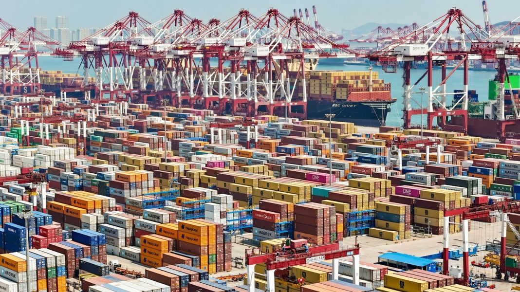 Bridge cranes load containers to a cargo ship at the Qingdao Free Trade Zone in Qingdao, Shandong province, China on April 15, 2025.