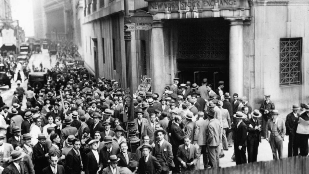 Crowds outside the New York Stock Exchange during the Wall Street Crash in the Financial District of Lower Manhattan, New York City, New York, Oct. 1929.