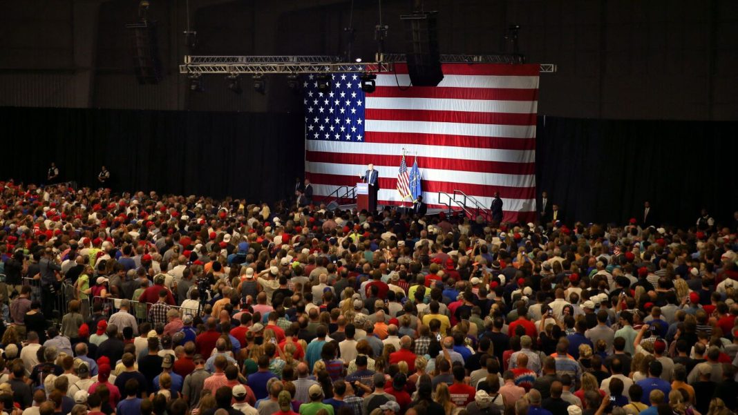 In 2016, Donald Trump, as the then-presumptive Republican nominee for U.S. president, addresses a campaign rally at the Grand Park Events Center in Westfield, Ind., where Trump’s current federal hiring freeze has forced a special local census to be put on hold.