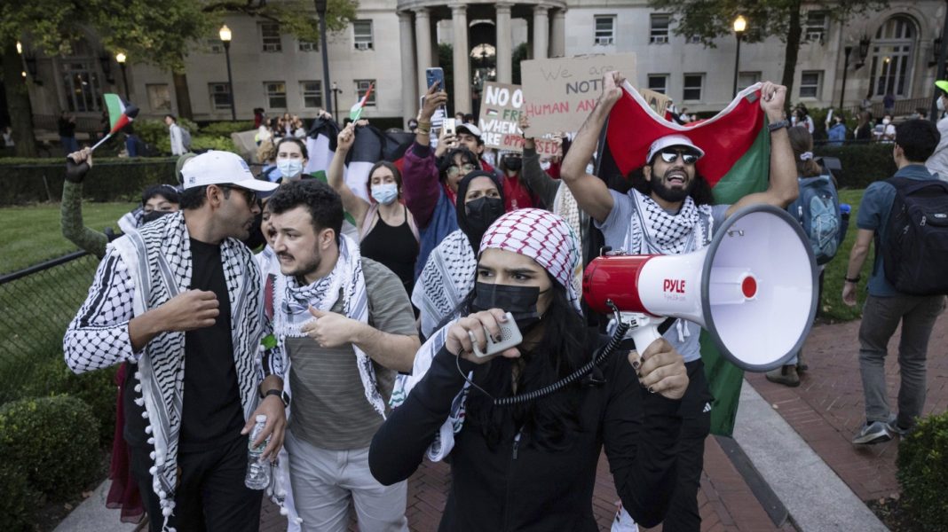 Palestinian supporters, including Mahmoud Khalil, second from left, demonstrate during a protest at Columbia University in October 2023 in New York.