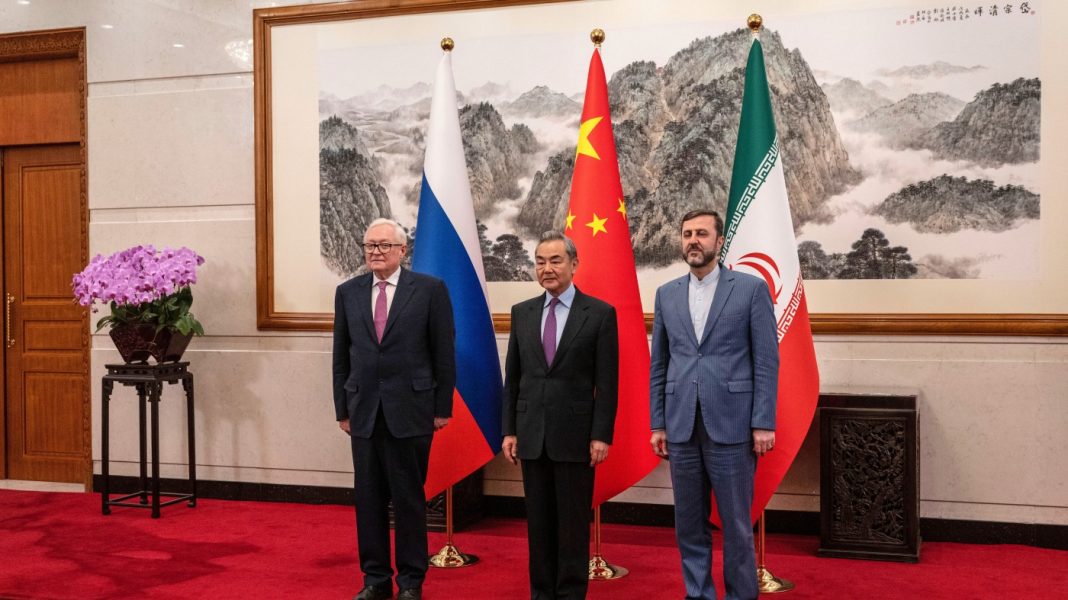 Chinese Foreign Minister Wag Yi, stands with Russian Deputy Foreign Minister Sergey Ryabkov, left, and Iranian Deputy Foreign Minister Kazeem Gharibabadi, right, before a meeting regarding the Iranian nuclear issue at Diaoyutai State Guest House on Thursday.