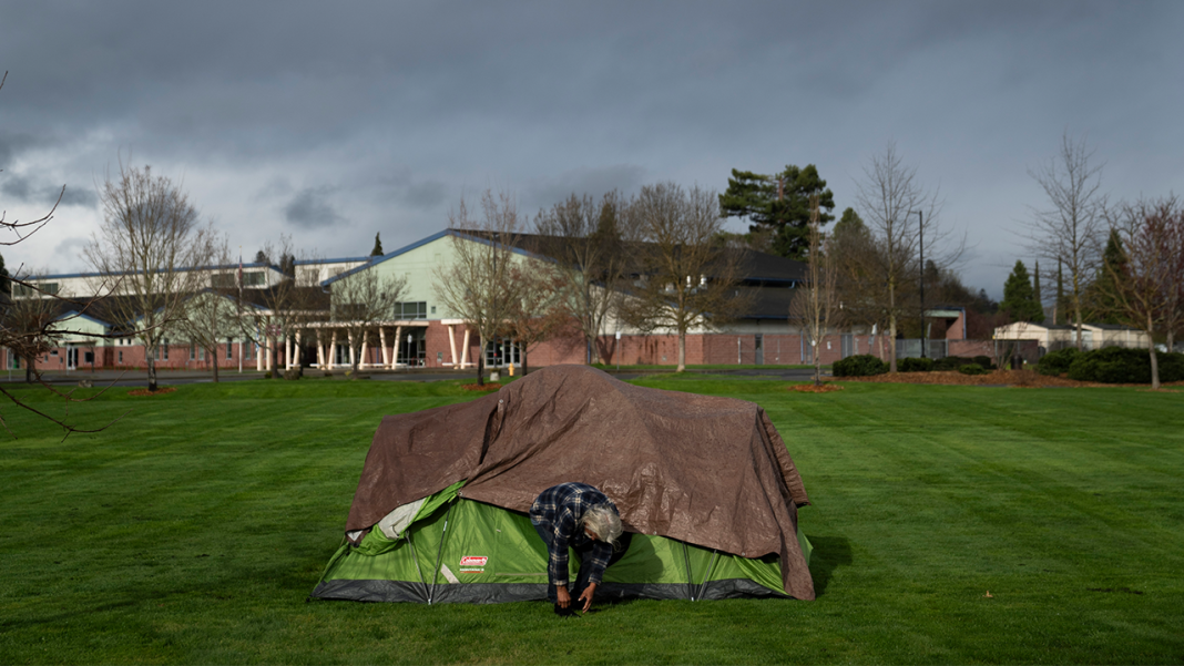 With Fruitdale Elementary School in the background, a homeless man adjusts his shoes at Fruitdale Park, March 23, 2024, in Grants Pass, Oregon. (AP)