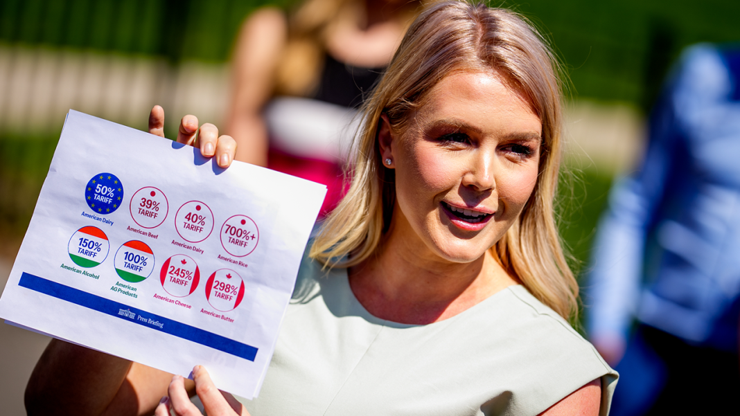 White House press secretary Karoline Leavitt speaks to the media March 31, 2025, on tariffs and provides update on Signal group chat leak. (Getty Images)