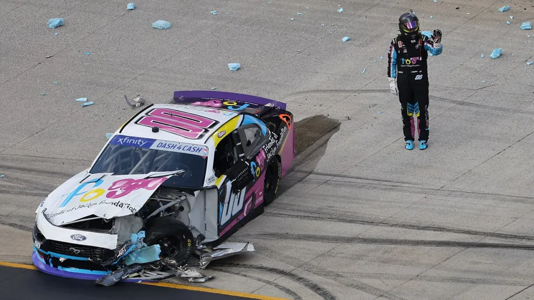 Sheldon Creed exits his car after crashing during the NASCAR SciAps 300 at Bristol Motor Speedway, April 12, 2025. (Randy Sartin-Imagn Images)