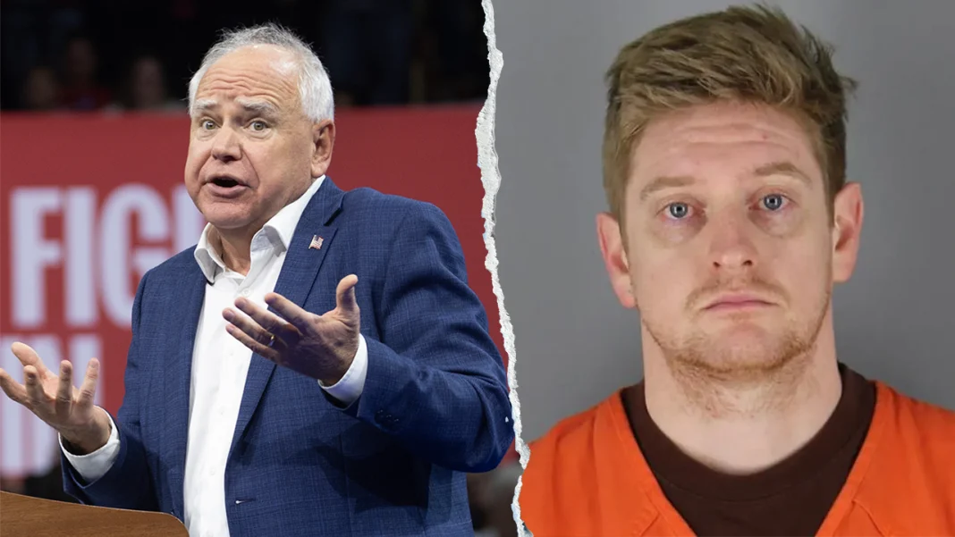 Gov. Tim Walz, D-Minn., did not respond to Fox News Digital request for clarity on Dylan Bryan Adams’ employment status at the Minnesota Department of Human Services. (Getty Images | Hennepin County Sheriff’s Office)