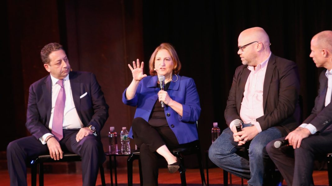 Washington Post columnist Ruth Marcus (in a blue jacket) speaks on stage during a panel at the New Yorker Festival in 2018.