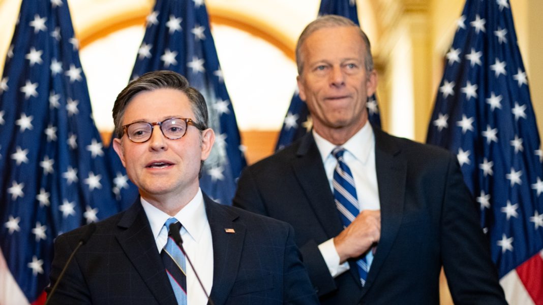 Speaker of the House Mike Johnson, R-La., left, and Senate Majority Leader John Thune, R-S.D., hold a news conference on passing the budget resolution in the U.S. Capitol on April 10, 2025. (Bill Clark/CQ-Roll Call, Inc via Getty Images)