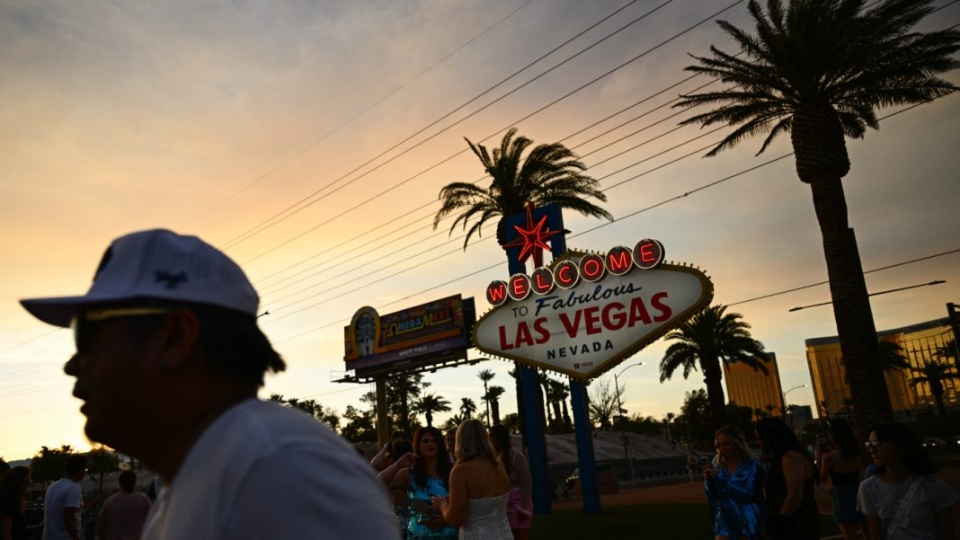 People take pictures with the Las Vegas sign in that city on July 29, 2023. Tourism industry leaders warn that recent actions by the Trump administration may be causing a drop in Canadians traveling to the U.S.