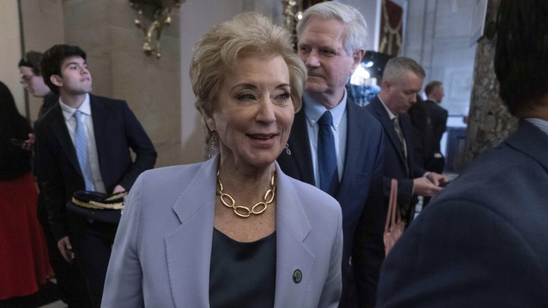 U.S. Education Secretary Linda McMahon leaves the House Chamber after President Donald Trump’s joint address to Congress on Tuesday.